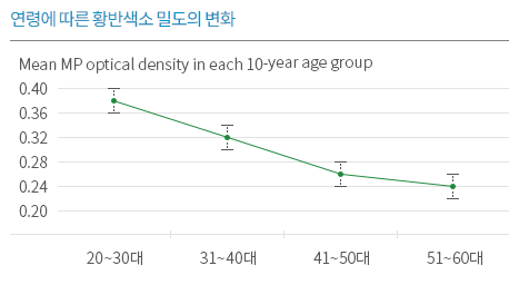 황반색소는 시력의 강함과 약함을 좌우하는 망막중심부‘황반’을 구성하는 색소로 루테인이 그 주요 성분입니다. 자외선이나 청색광 등의 유해광선을 차단하며, 유해산소로부터 우리 눈을 보호해주는 고마운 황반색소는 20대를 기점으로 감소하기 시작하여 50대에는 65 % 수준까지 줄어들게 됩니다. 황반색소는 체내에서 생성되지 않으므로, 음식이나 건강기능식품으로 루테인 등의 황반색소를 보충하여 예방하는 것이 중요합니다. 그리고 흡연자의 경우 감소되는 속도가 더욱 빨라지게 됩니다.