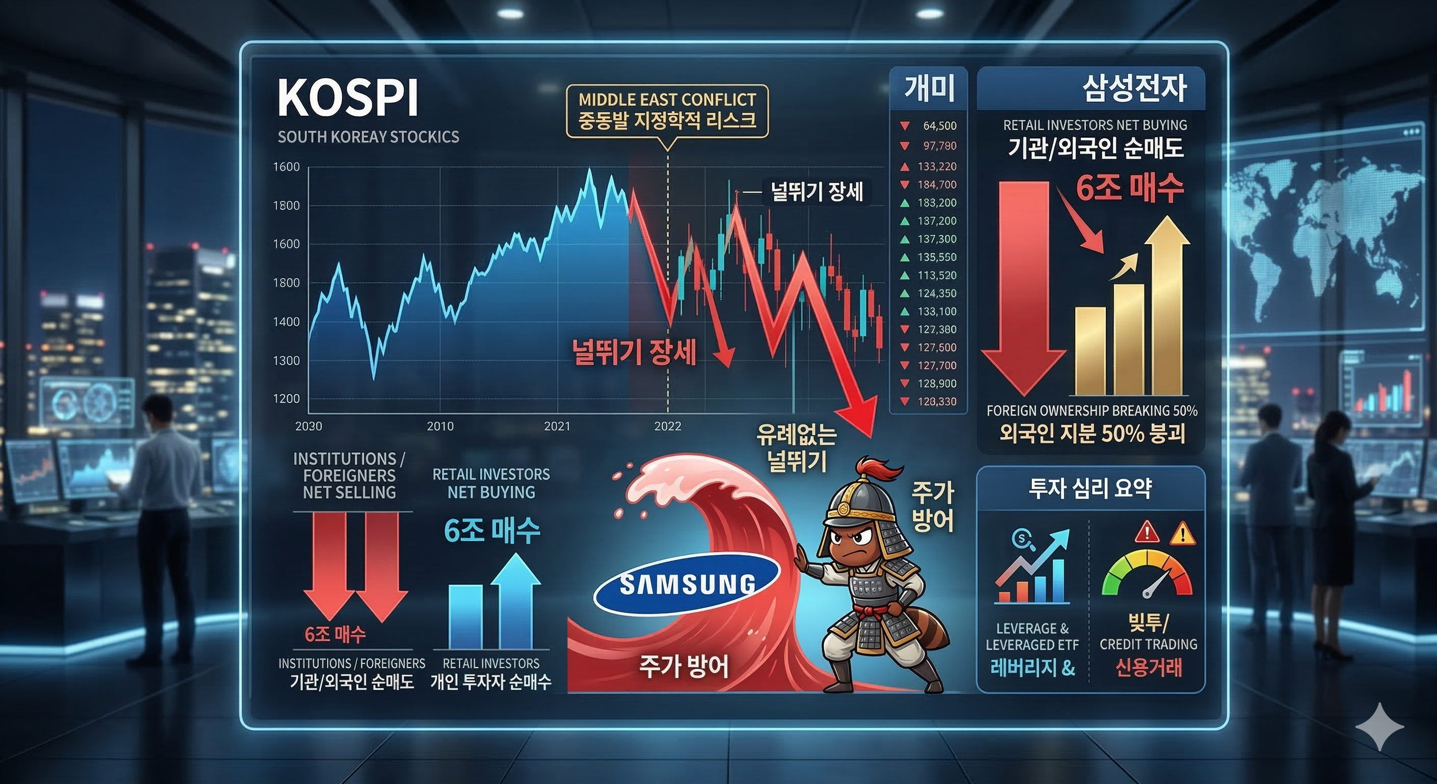 최근 중동발 지정학적 리스크로 국장(국내 증시)이 요동치고 있습니다. 특히 대장주인 삼성전자를 둘러싼 수급 공방이 치열한데요. 외국인과 기관이 물량을 쏟아내는 가운데, 개인 투자자들이 이를 고스란히 받아내며 '주가 방어'에 나섰습니다. 오늘은 삼성전자의 최근 수급 현황과 증권가 전망, 그리고 주의해야 할 리스크를 정리해 드립니다.