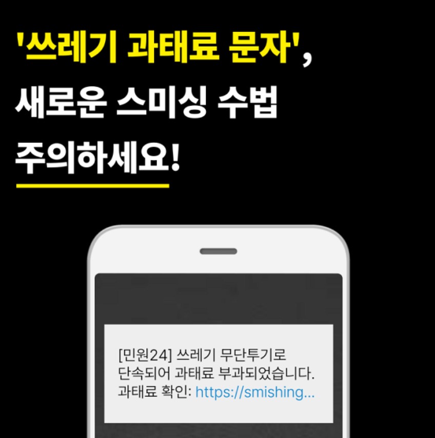 스미싱은 sms(문자메시지)와 피싱(phishing)의 합성어으로 문자메시지를 이용한 피싱이고, 신뢰할 수 있는 사람 또는 기업이 보낸 것처럼 가정하여 개인비밀정보를 요구하거나 소액결제를 유도한다. 최근에 관공서를 사칭한 쓰레기 과태료문자, 쓰레기 불법 투기 문자와 같은 폐기물관리법 위반관련 스미싱 사례가 급증하고 있습니다. 새로운 스미싱 수법에 각별이 조심하세요