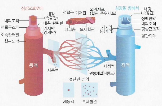 혈관은 동맥, 정맥, 모세혈관이 있다. 동맥은 심장에서 출발해서 인체의 각 조직에 산소를 전달하는 혈관이고, 모세혈관은 동맥과 정맥을 연결하는 그물 모양의 얇은 혈관이며, 정맥은 조직이 사용하고 남은 노폐물을 폐로 다시 가져간다. 혈행은 혈관을 통하여 혈액이 신체의 각 부분으로 움직이는 것으로 정의할수 있다.