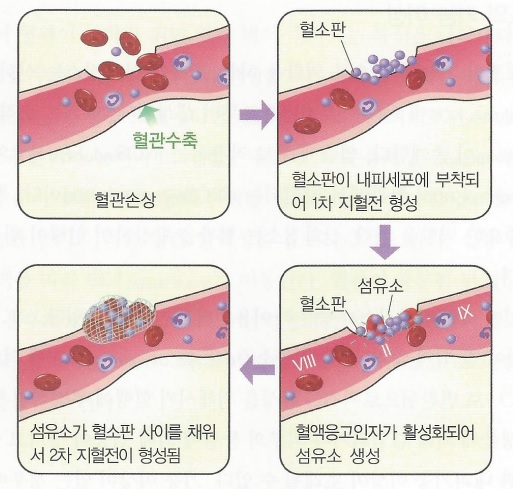 혈관에 상처가 생겨 혈액이 산소와 접하게 되면 지혈반응이 시작된다. 지혈반응은 크게 혈관단계, 혈소판단계, 응고단계를 거친다. 혈관이 수축하고 혈소판이 손상된 혈관 내피세포에 부착하여 손상된 부분을 매워서 출혈이 일어나지 않게 만든다. 혈소판은 활성화되면서 세포토닌(serotonin), 칼슘(ca²+), 트롬복산 A2(thromboxane A2), TXA2 등을 생성시켜 주위의 다른 혈소판의 응집을 늘리고, 혈장에 존재하는 혈액응고인자 Ⅷ, Ⅱ, Ⅸ와 반응하여 혈전(blood clot)을 형성함으로써 지혈이 효과적으로 일어날 수 있도록 한다. 하지만 이러한 과정이 너무 심하게 일어나는 경우 혈행을 방해할 수 있다. 마지막으로 혈액 내의 응고인자들이 순차적으로 활성화되면서 생성된 섬유소가 일차적으로 만들어진 혈전에 부착되면서 출혈을 완전히 막은 '응고단계'가 일어난다. 지혈작용은 손상된 부위로부터의 혈액의 손실을 최소화하고 혈액의 정상적인 순환을 유지하기 위한 방어기전이라 할 수 있다.