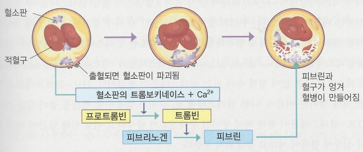 혈액응고과정 : 혈액 응고에 주로 관여하는 것은 혈소판이며, 혈소판 파괴 시 트롬보키네이스가 혈장으로 방출된다. 혈장에 존재하는 프로트롬빈은 트롬보키아네이스에 의해 트롬빈으로 전환되며, 트롬빈은 피브리노겐을 피브린(섬유소 단백질)으로 전환시킨다. 이 과정에서 칼슘이온과 비타민K가 조효소로 작용한다. 피브린이 백혈구, 적혈구와 서로 엉켜서 형성된 것을 혈병이라고 한다.